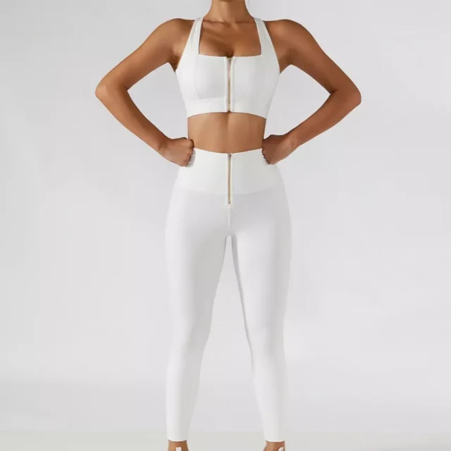 Every stitch and contour of this yoga set is designed with you in mind. The high-waist leggings paired with a unique skirt design not only adds a dash of elegance but also provides added coverage. The front zipper bra ensures ease of wear, making changing post-workout a breeze. So, whether you’re in a deep stretch or on a cycling spree, you’re guaranteed a blend of style and functionality.