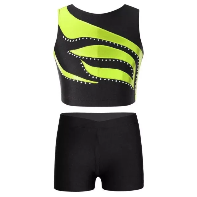 Girls Dance & Gymnastics Outfit – Sleeveless Shiny Rhinestone Crop Top with Shorts